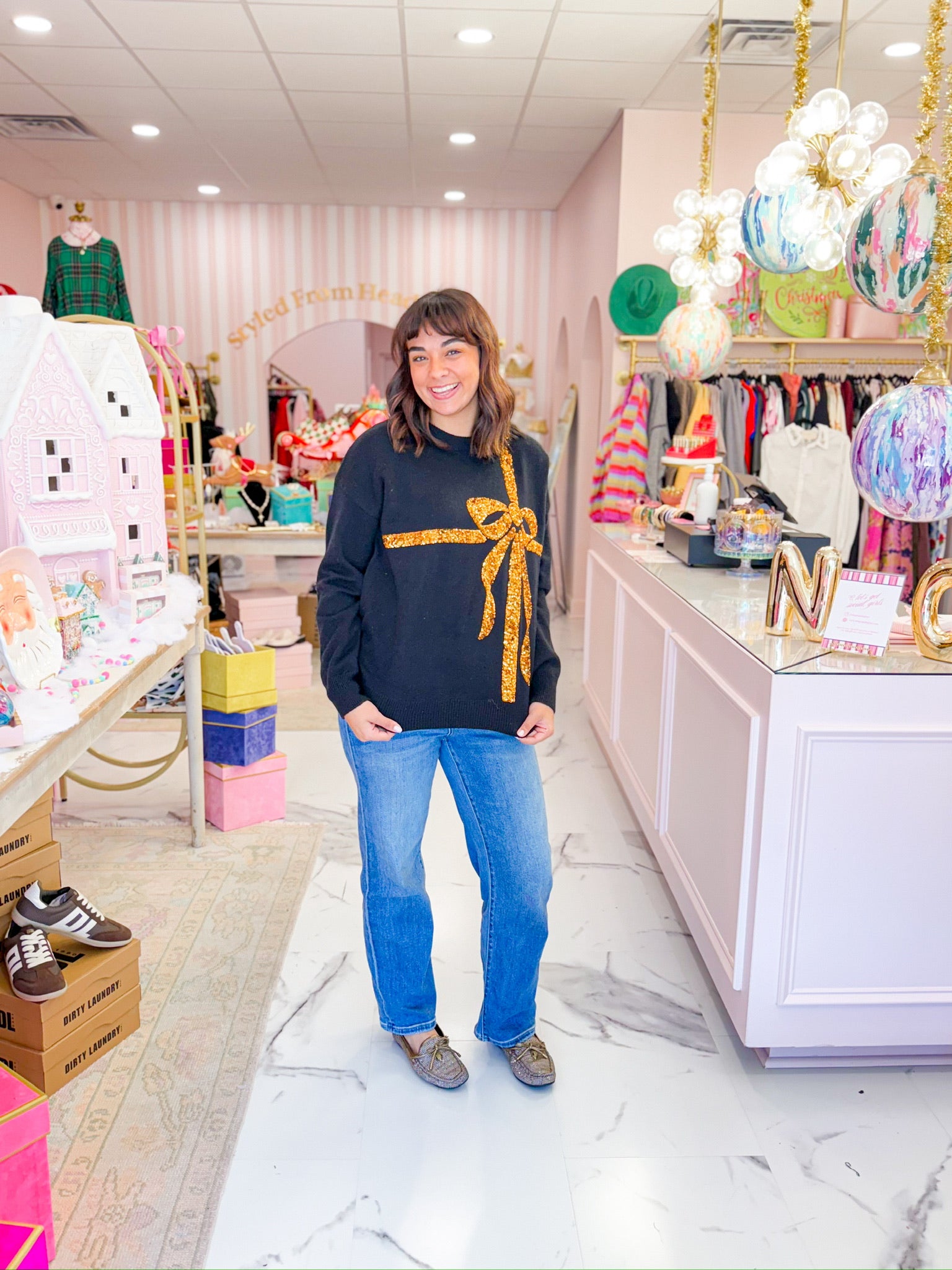 This sleek black sweater gets an irresistible twist with a bold gold glitter bow wrapped around it, making it look like a stylish, festive gift. The soft, cozy fabric contrasts beautifully with the eye-catching, glittering bow, adding a playful, elegant touch to your look. Perfect for holiday parties or any occasion when you want to stand out, this sweater brings a little extra sparkle and fun to your wardrobe. The shimmering gold glitter catches the light with every move, making sure you shine bright no matter where you go.