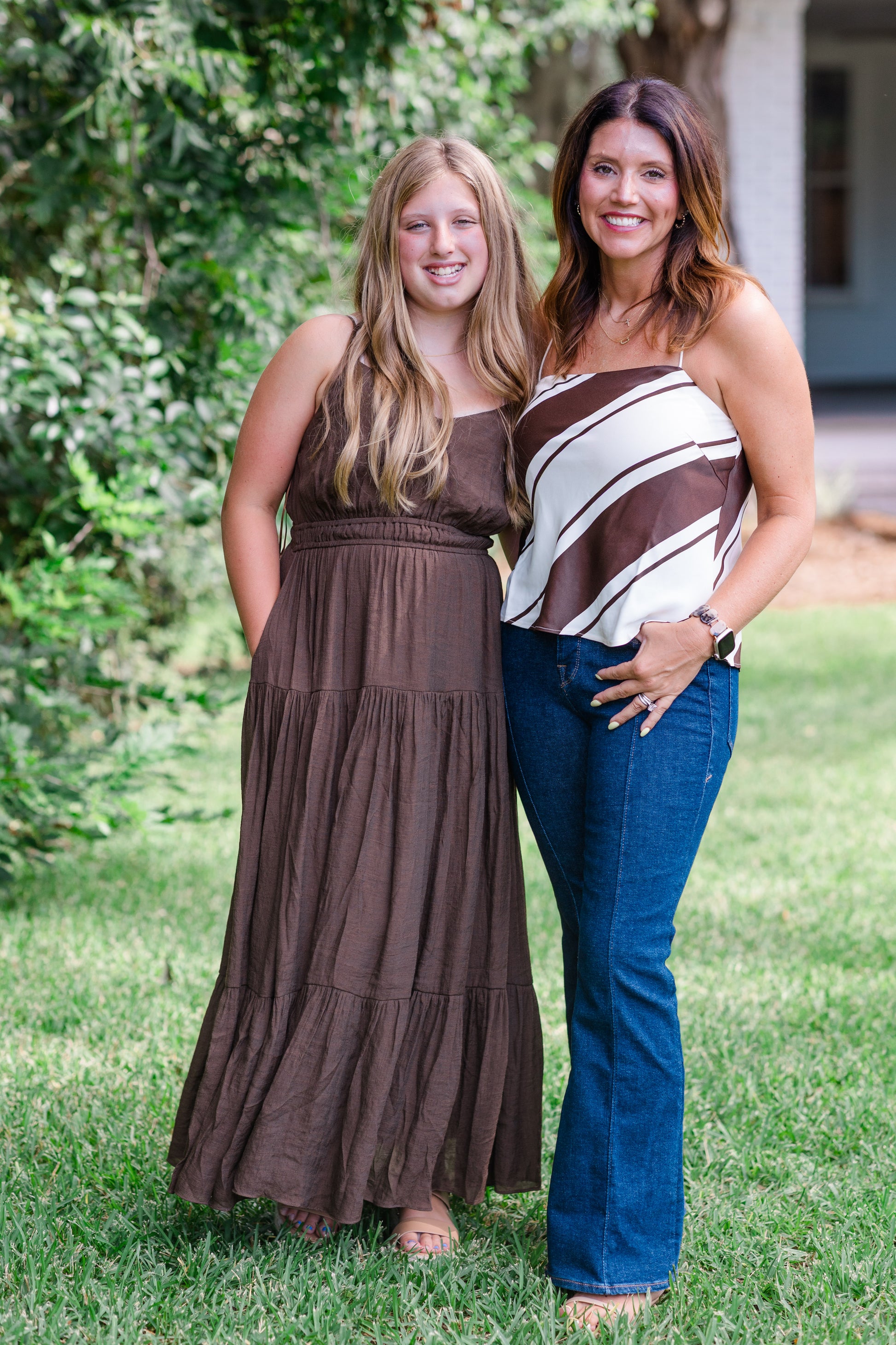 Chic and modern, this silky cami features a bold diagonal mocha and cream stripe print with a sleek square neckline and adjustable spaghetti straps. Its relaxed fit makes it perfect for pairing with the matching pants or dressing up with denim for a night out.