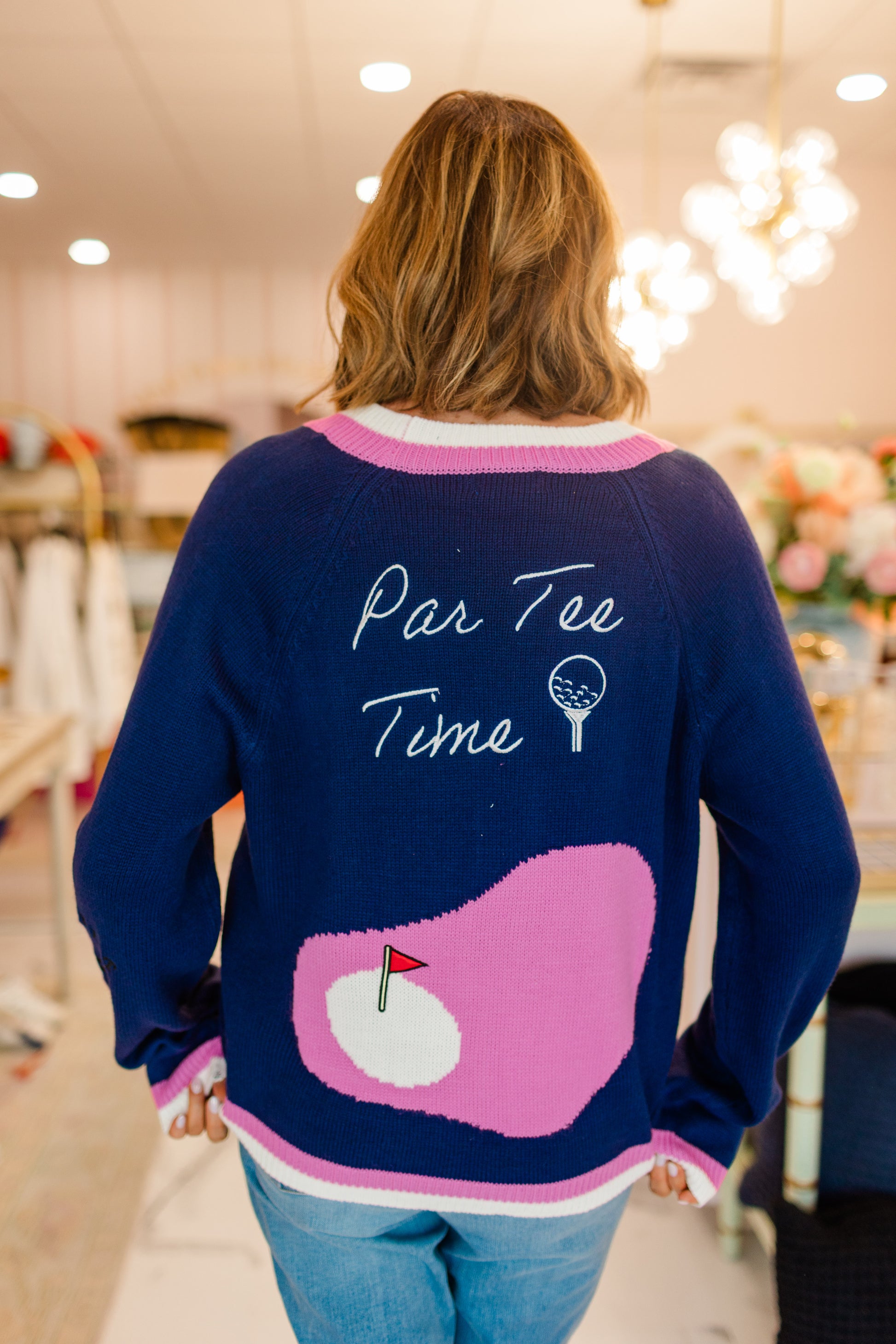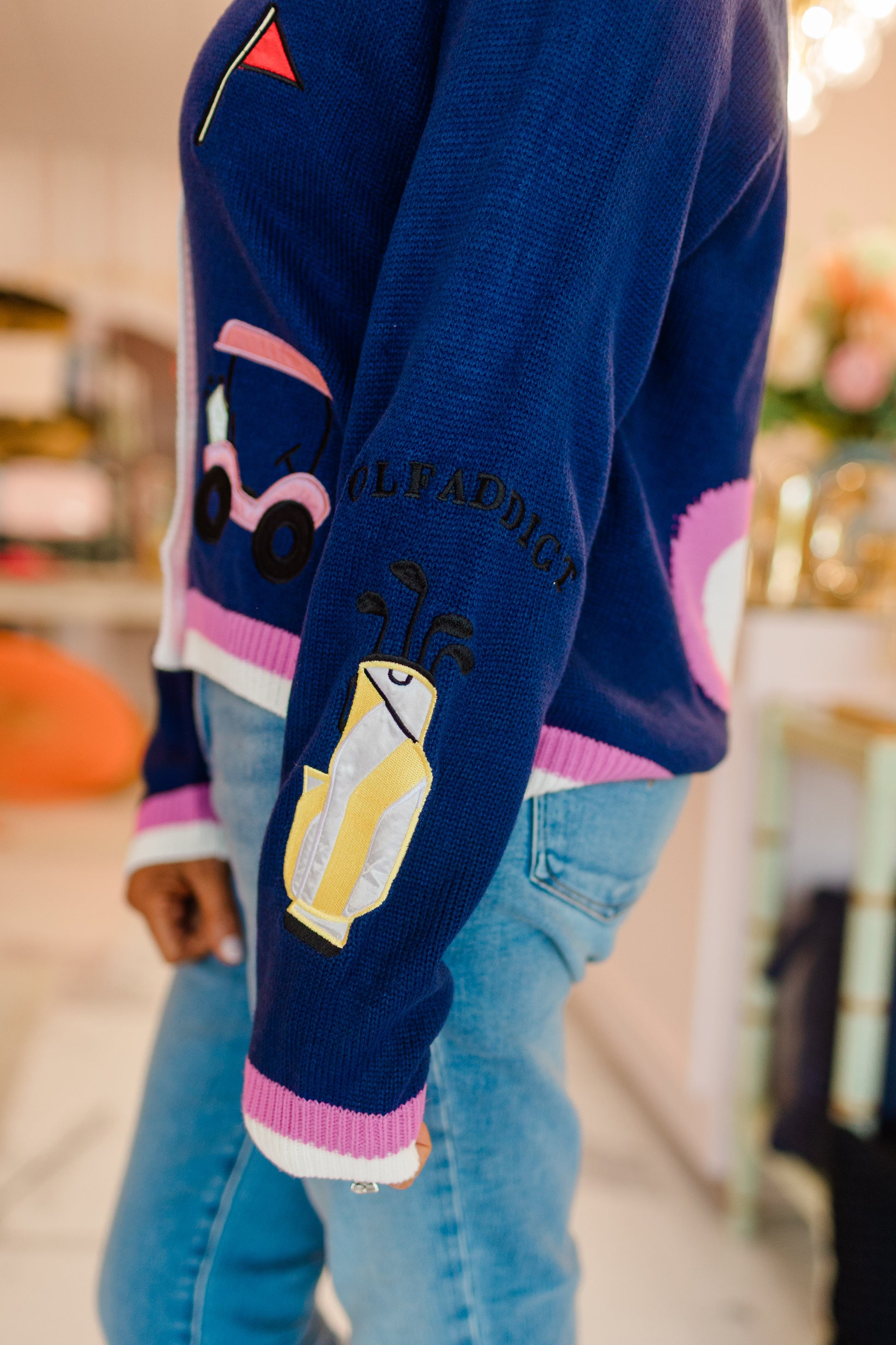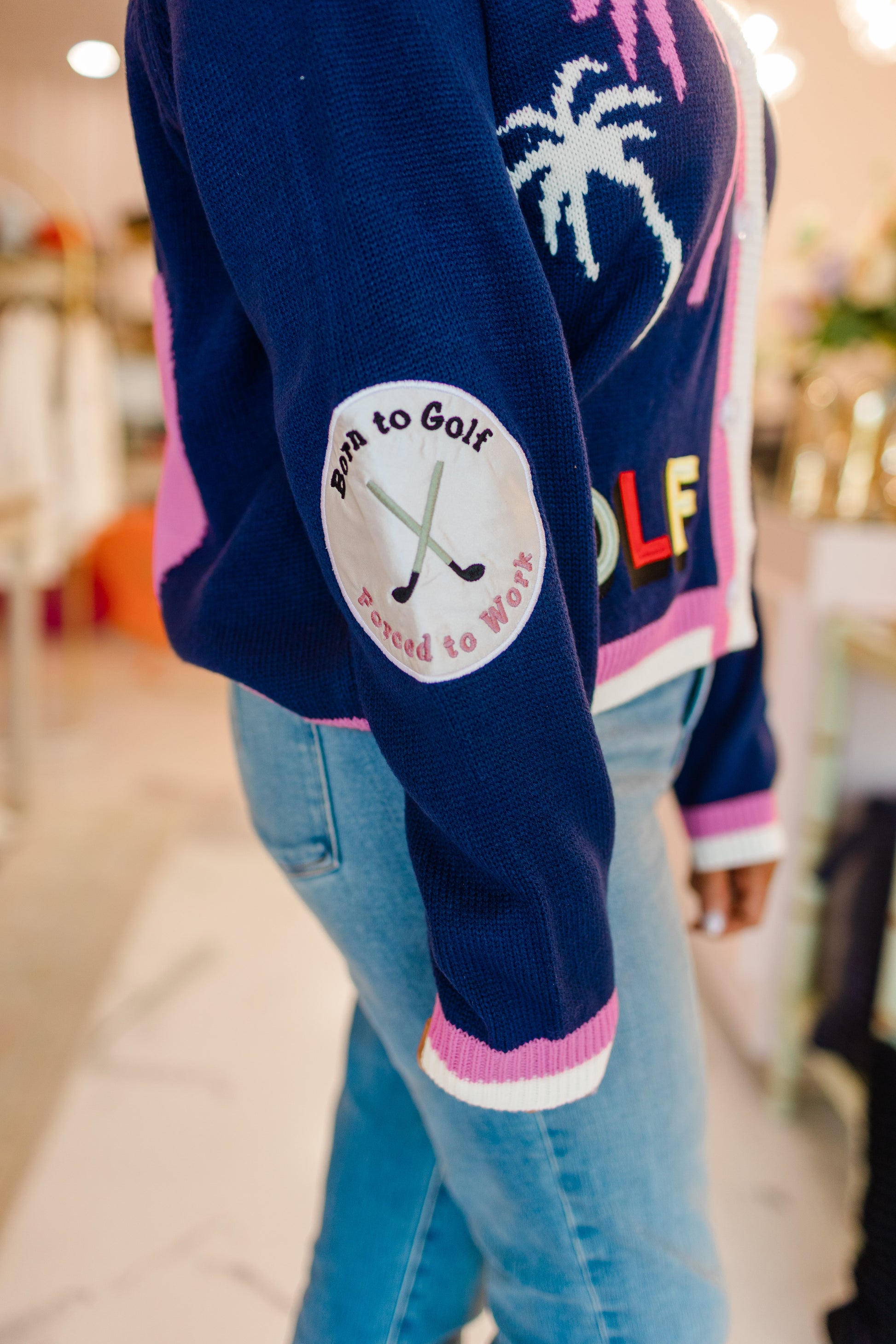 Serve up style on and off the course with The Country Club Cardigan. This statement knit brings major charm with its bold navy base, retro golf-inspired patches, and pops of pink and white trim. From the palm tree detail to the golf cart and flagstick, every element is tee-rific. Button it over denim or toss it over a dress — it's preppy, playful, and totally par for your closet.