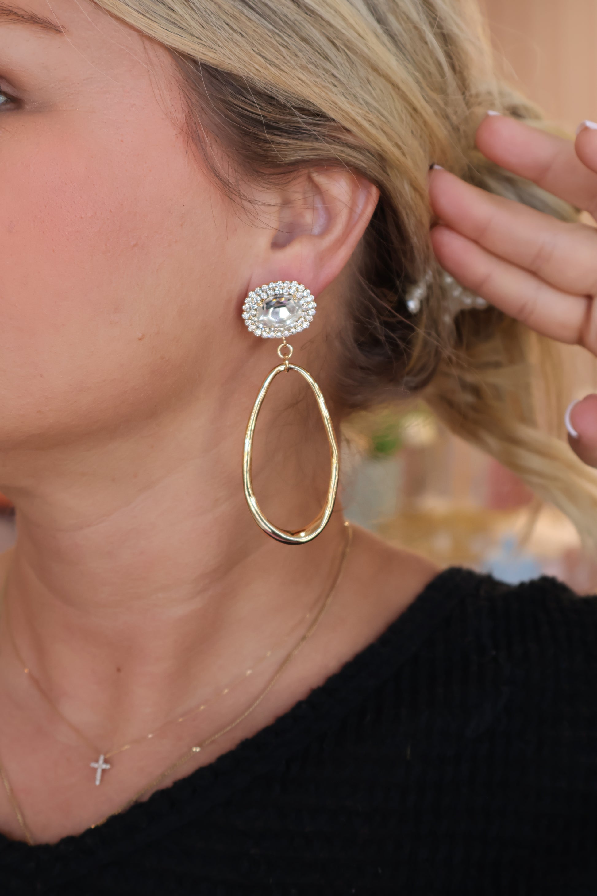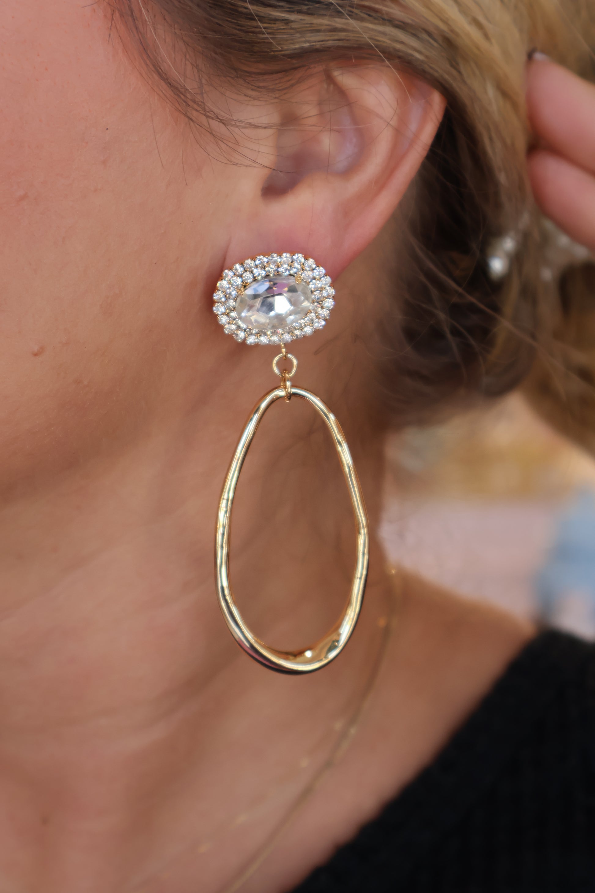 The Elegance Drop Earrings - Crystal feature a sparkling crystal at the ear, offering a touch of radiant shine. Below, a sleek gold drop gently hangs, creating a balanced and sophisticated design. These earrings bring a perfect blend of sparkle and sophistication to your style.
