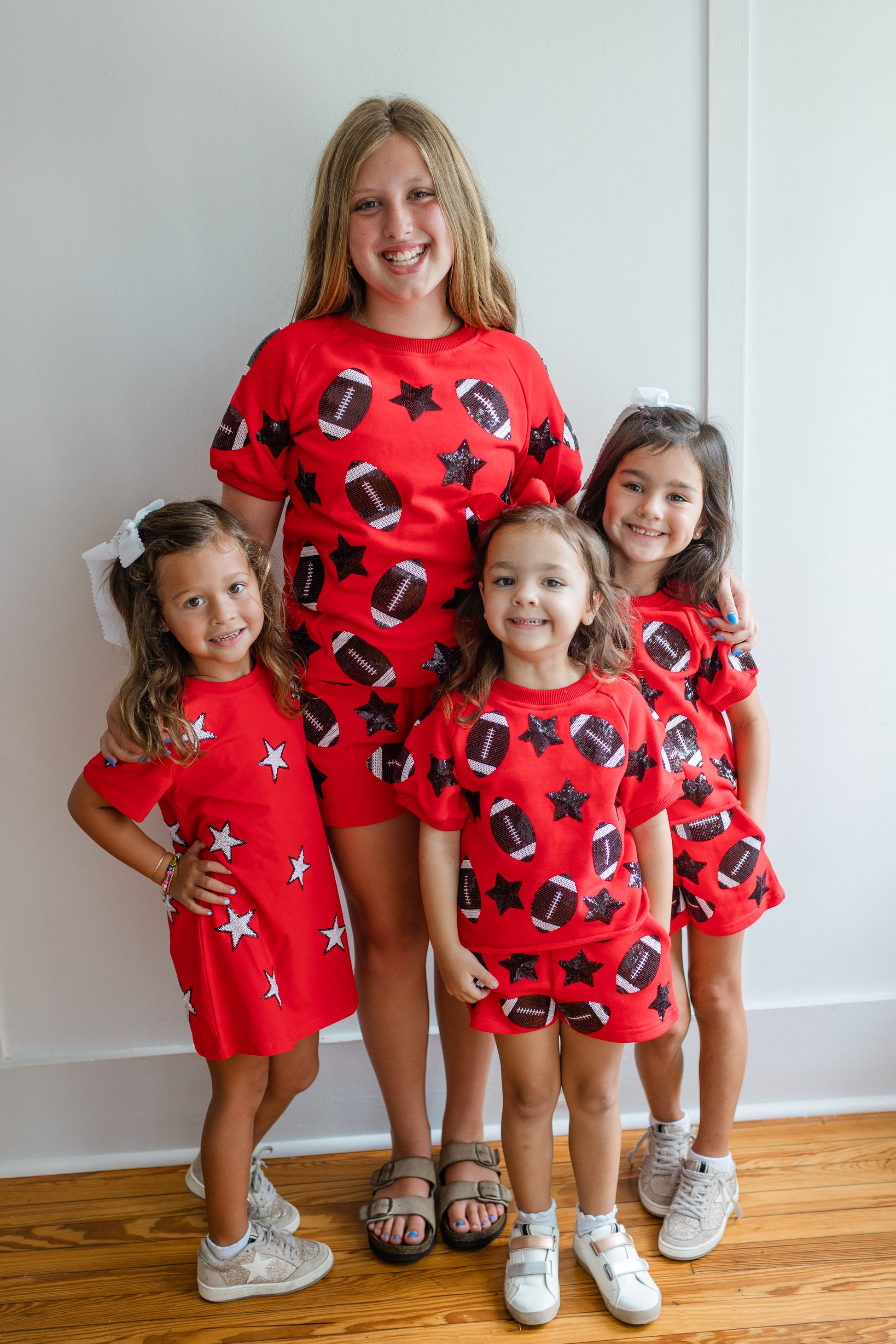 A playful spin on classic school-day style, this lightweight knit dress features bold star prints in maroon and gray—perfect for cheerleading spirited outings or everyday fun. The fit-and-flare silhouette offers a comfortable, easy-on tee-style top with a twirly skirt that kids will love spinning in.