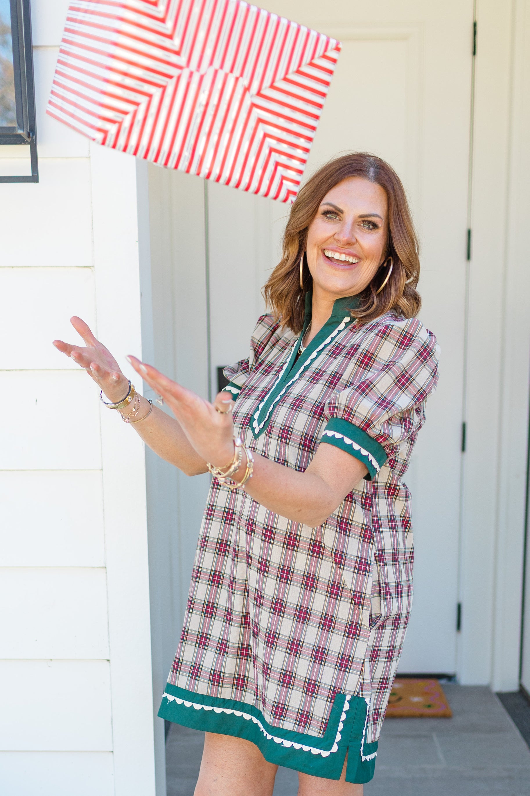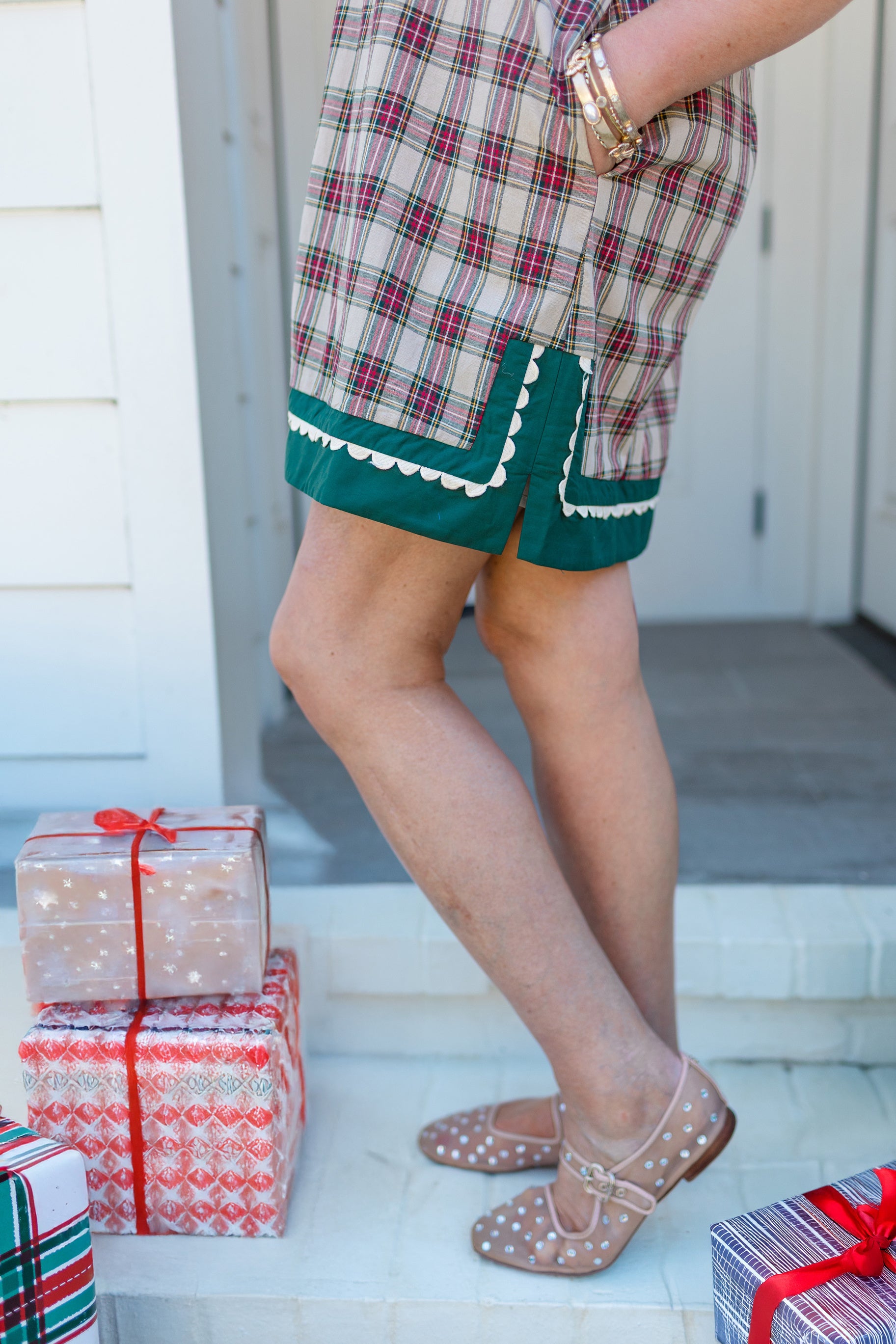 A polished twist on classic Christmas plaid. The Northhill Dress blends structured charm with an easy shift silhouette, detailed with green scalloped trim and short puff sleeves. Pair with tights and booties or flats for a warmer December day — it’s festive without trying too hard.