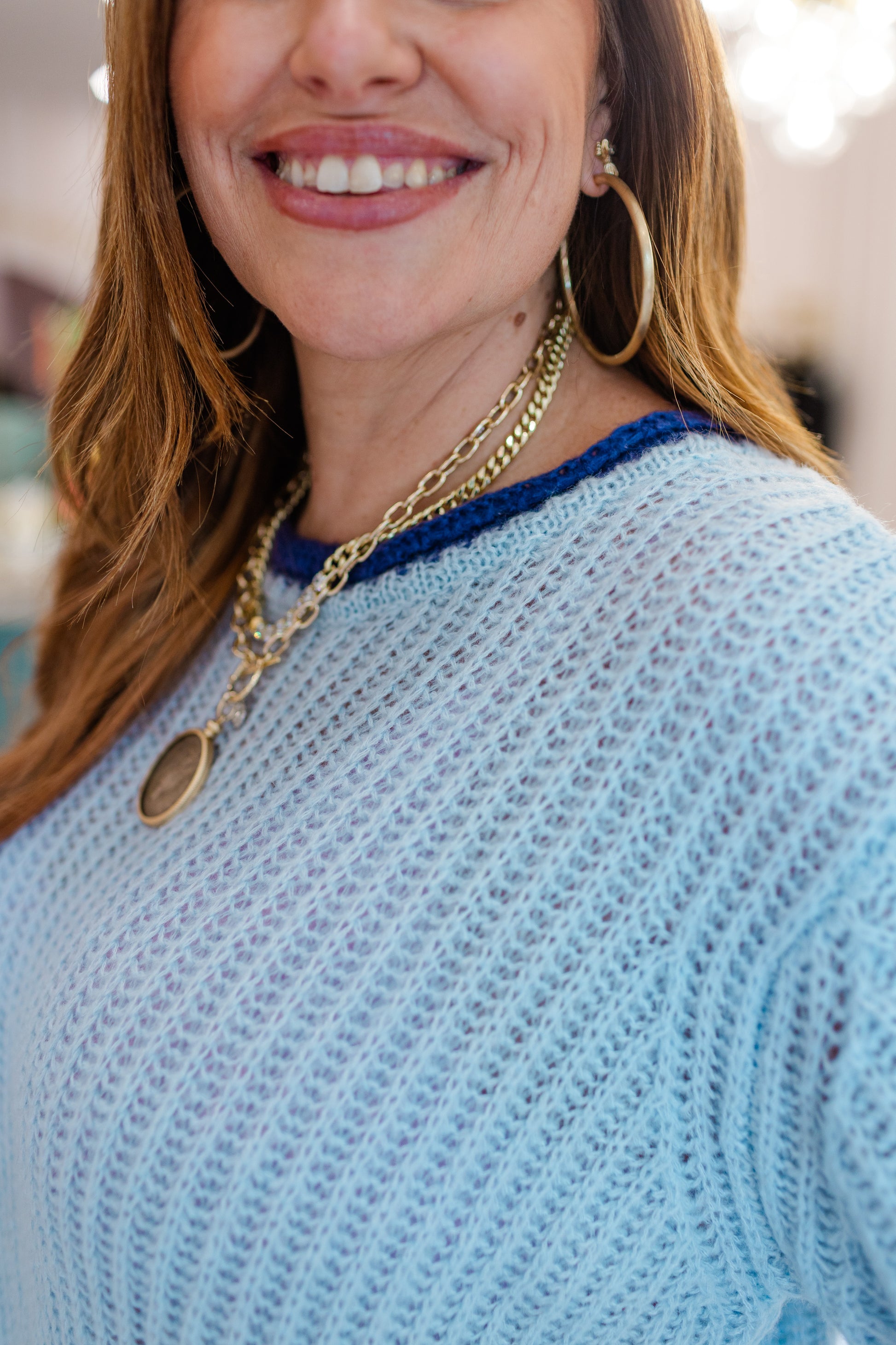 The Skyline Knit Top blends casual comfort with modern edge. Featuring a soft sky-blue open-knit design outlined in bold navy trim, this short-sleeve sweater brings effortless style to your everyday look. Its relaxed silhouette and lightweight feel make it perfect for layering or wearing on its own for an easy, elevated vibe.