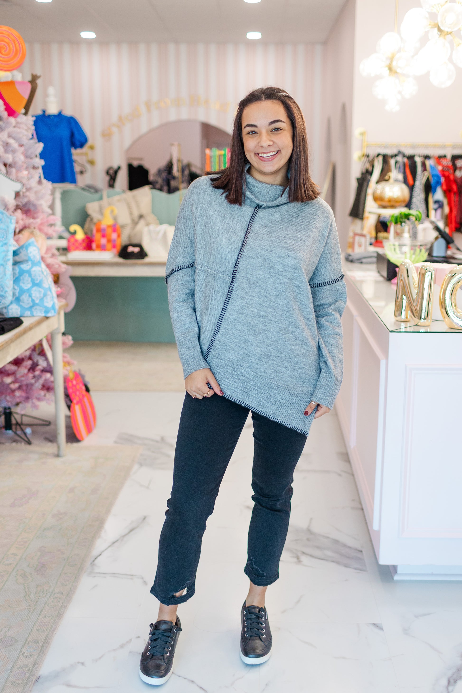 Cozy with a modern edge, the Stitch Detail Funnel Sweater is all about the details. Featuring a relaxed fit, exposed seam stitching, and a soft funnel neck, this heather grey knit blends comfort with contemporary style. Perfect for layering or wearing solo, it’s an effortless go-to for laid-back days with a chic twist.