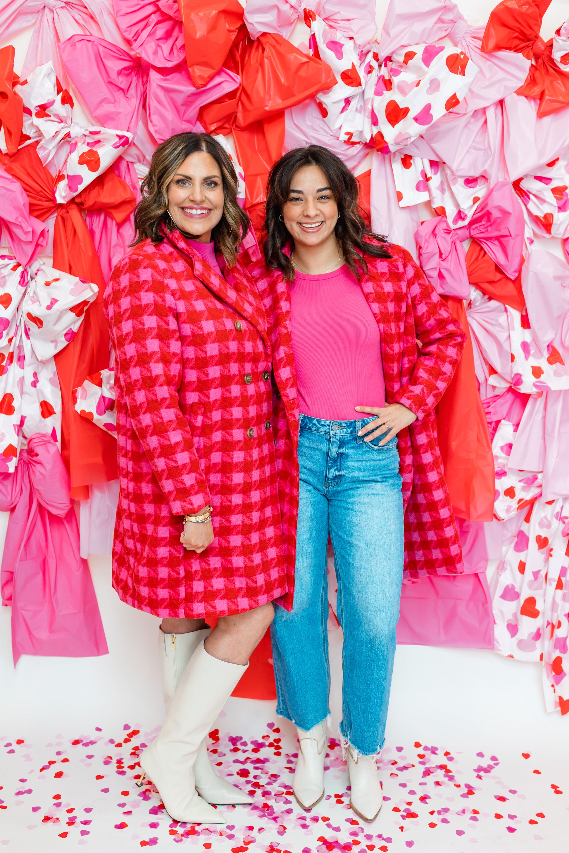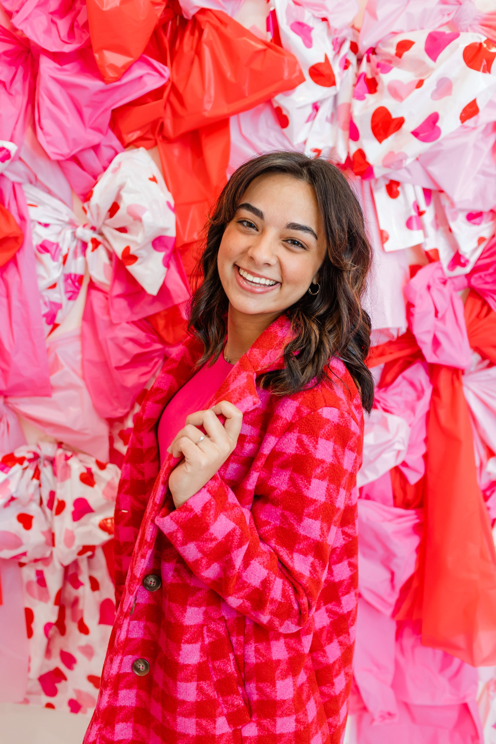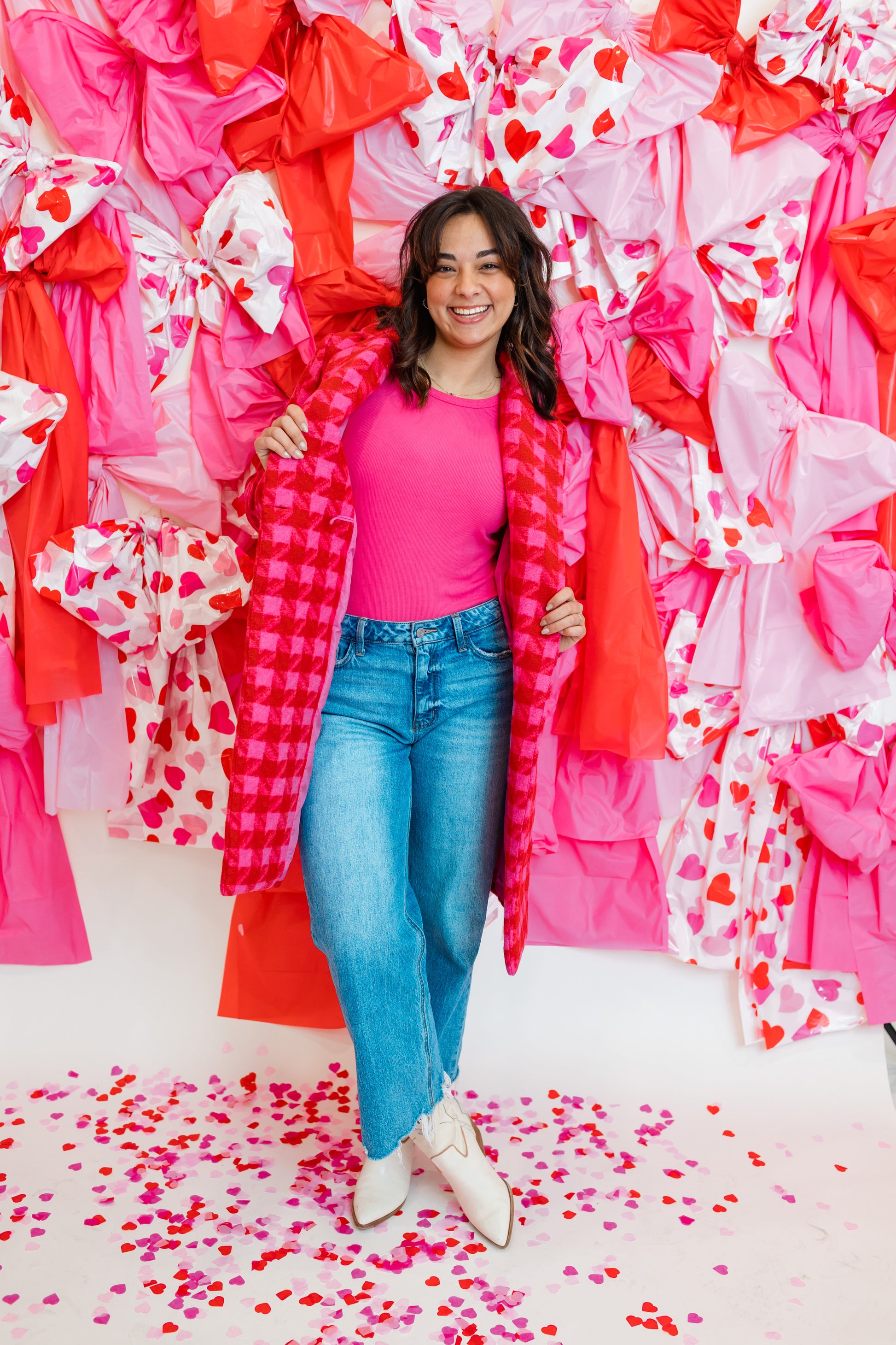 The Blakely is that statement coat you throw on and instantly look pulled together. Featuring a bold pink and red houndstooth print with a tailored, double-breasted front, it’s cozy, polished, and made for elevating even the simplest outfit. Perfect over denim and a basic knit or dressed up for dinner — this one turns heads in the best way.