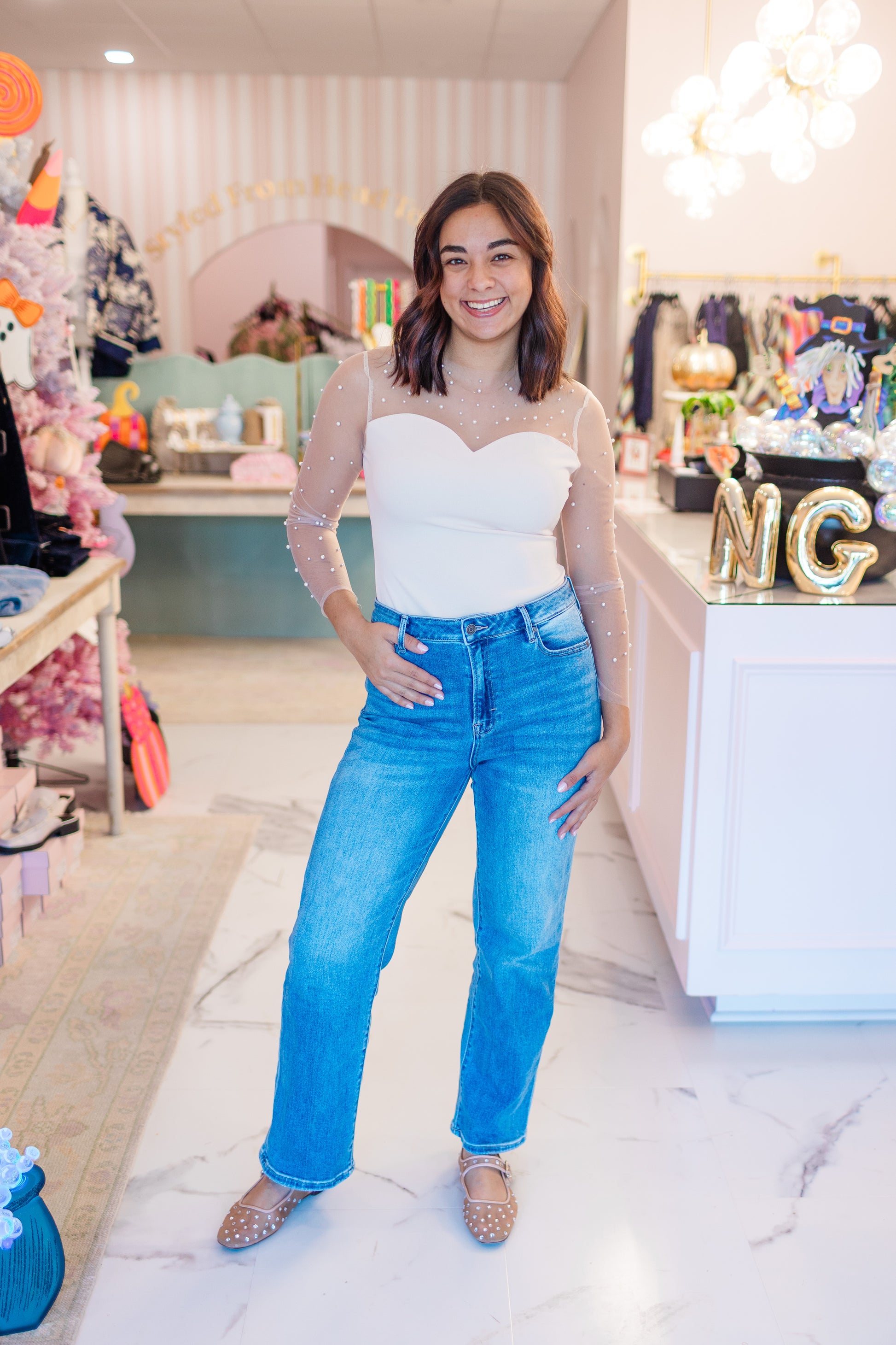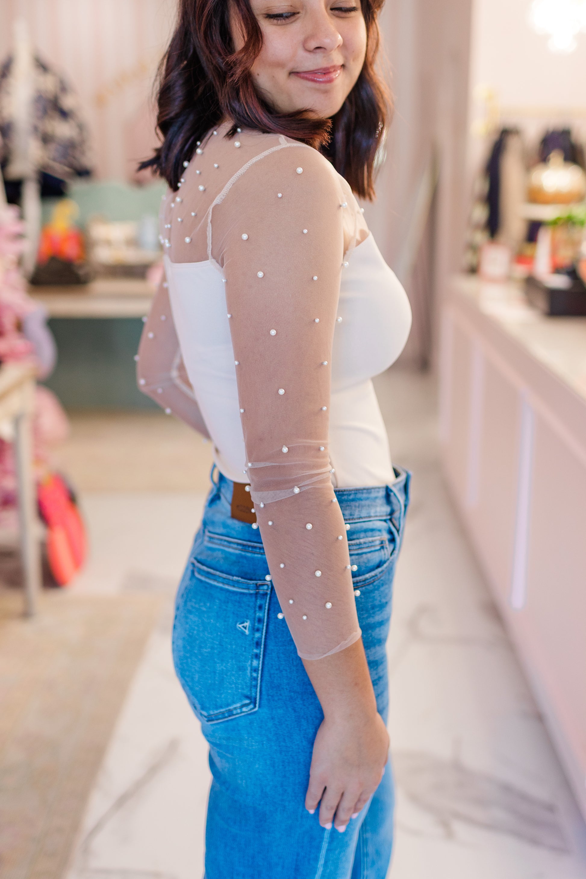 Understated and effortlessly beautiful, The Celeste Bodysuit is the definition of quiet femininity. Designed with a sweetheart neckline and sheer mesh sleeves adorned in delicate pearls, it’s a piece that feels both timeless and refined. Perfect for layering under blazers, dressing up denim, or worn alone for special moments — an elegant choice for brides and beyond.