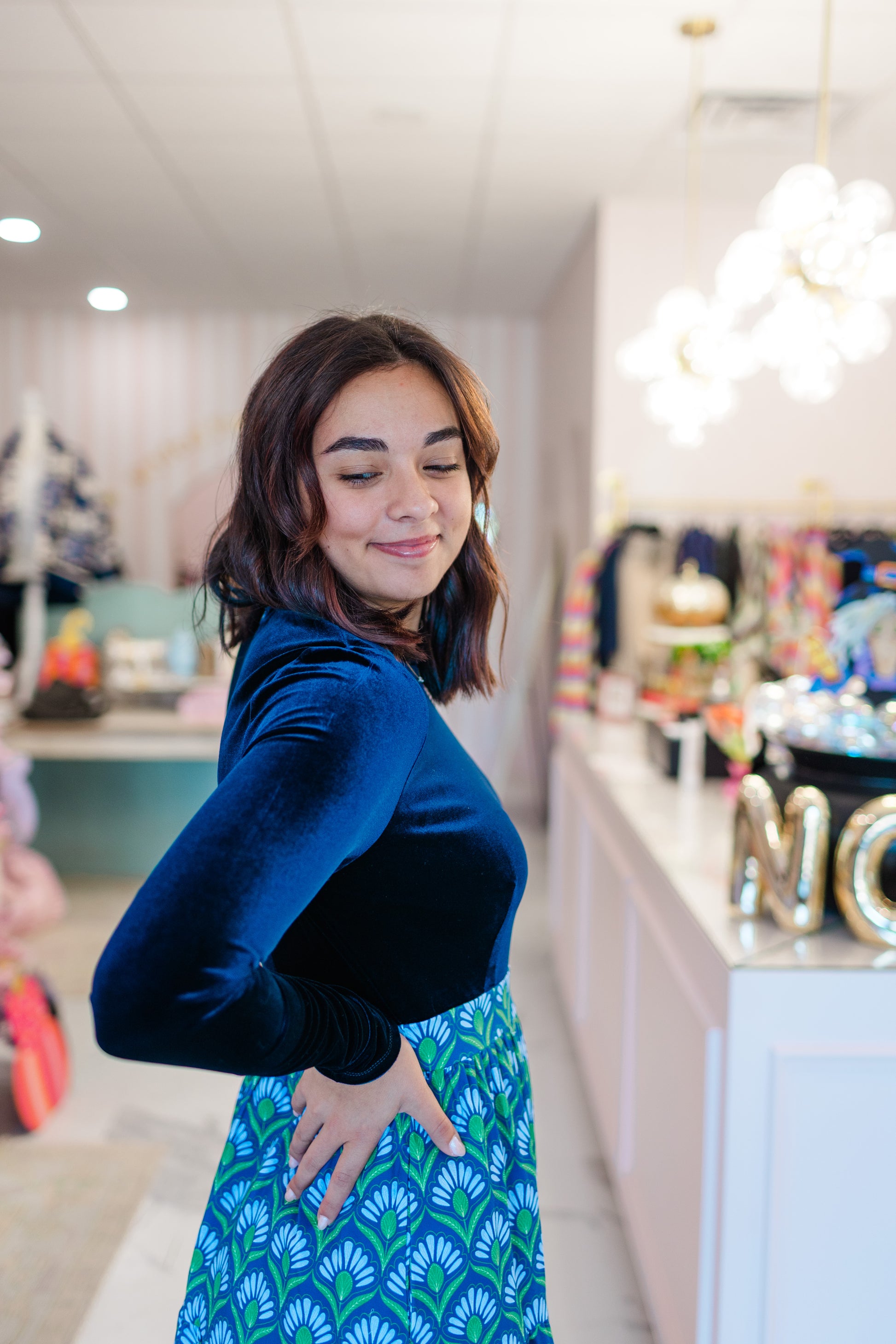 A showstopping piece from Prosperina, The Midnight Garden Dress blends a deep velvet bodice with a boldly patterned skirt that feels like wearable art. The rich midnight-blue top creates a soft, sculpted fit, while the flowing printed skirt moves beautifully with every step. Designed to look and feel like a $265 dress, but offered exclusively at Natalie Grace for $175 — it’s quiet luxury, reimagined.