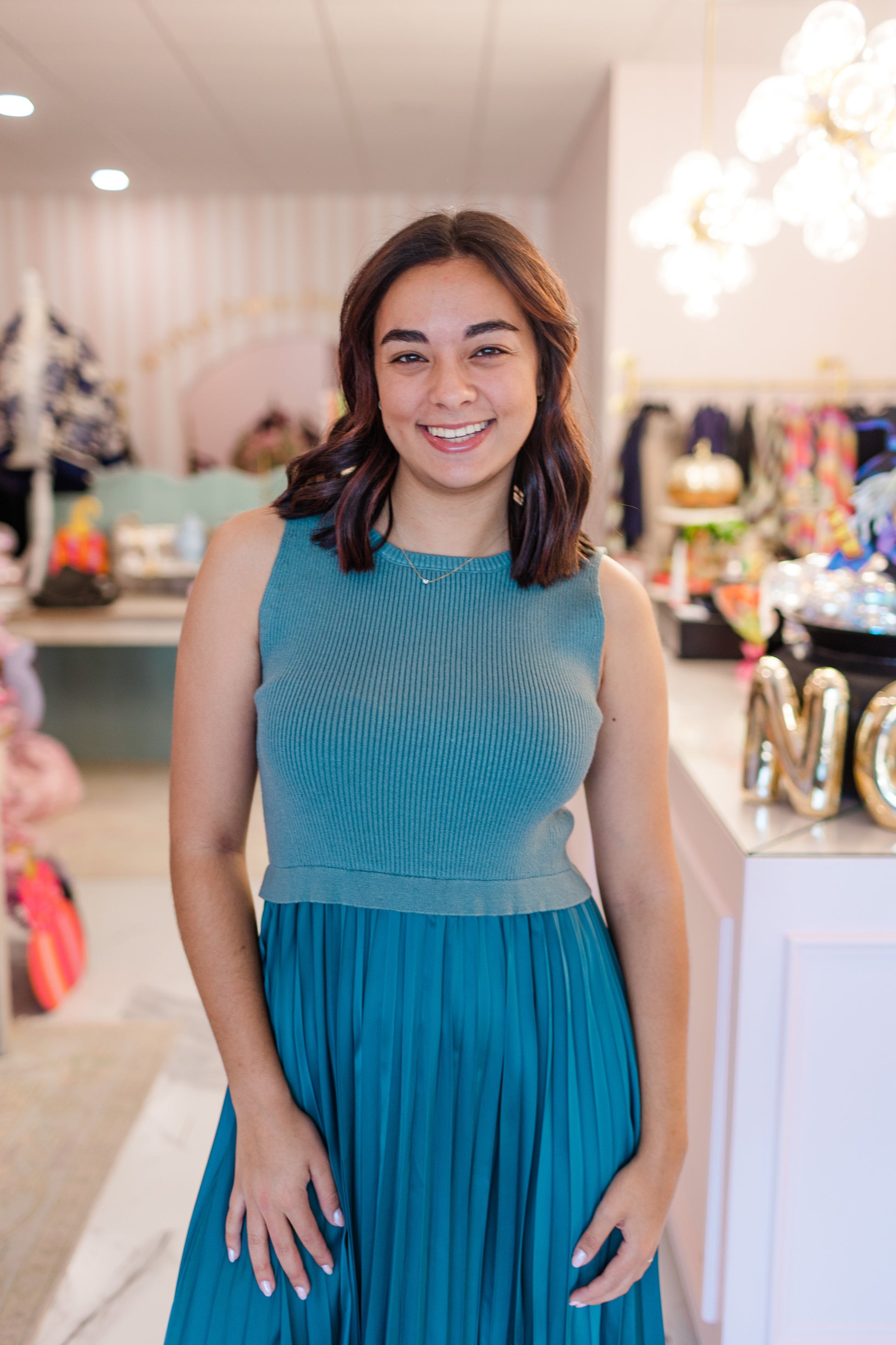 A timeless silhouette that pairs structure with ease. The ribbed knit bodice gives a soft, flattering fit while the pleated skirt flows with every step. In deep autumn tones, it’s the dress you’ll reach for on orchard strolls, dinners out, and everything in between.