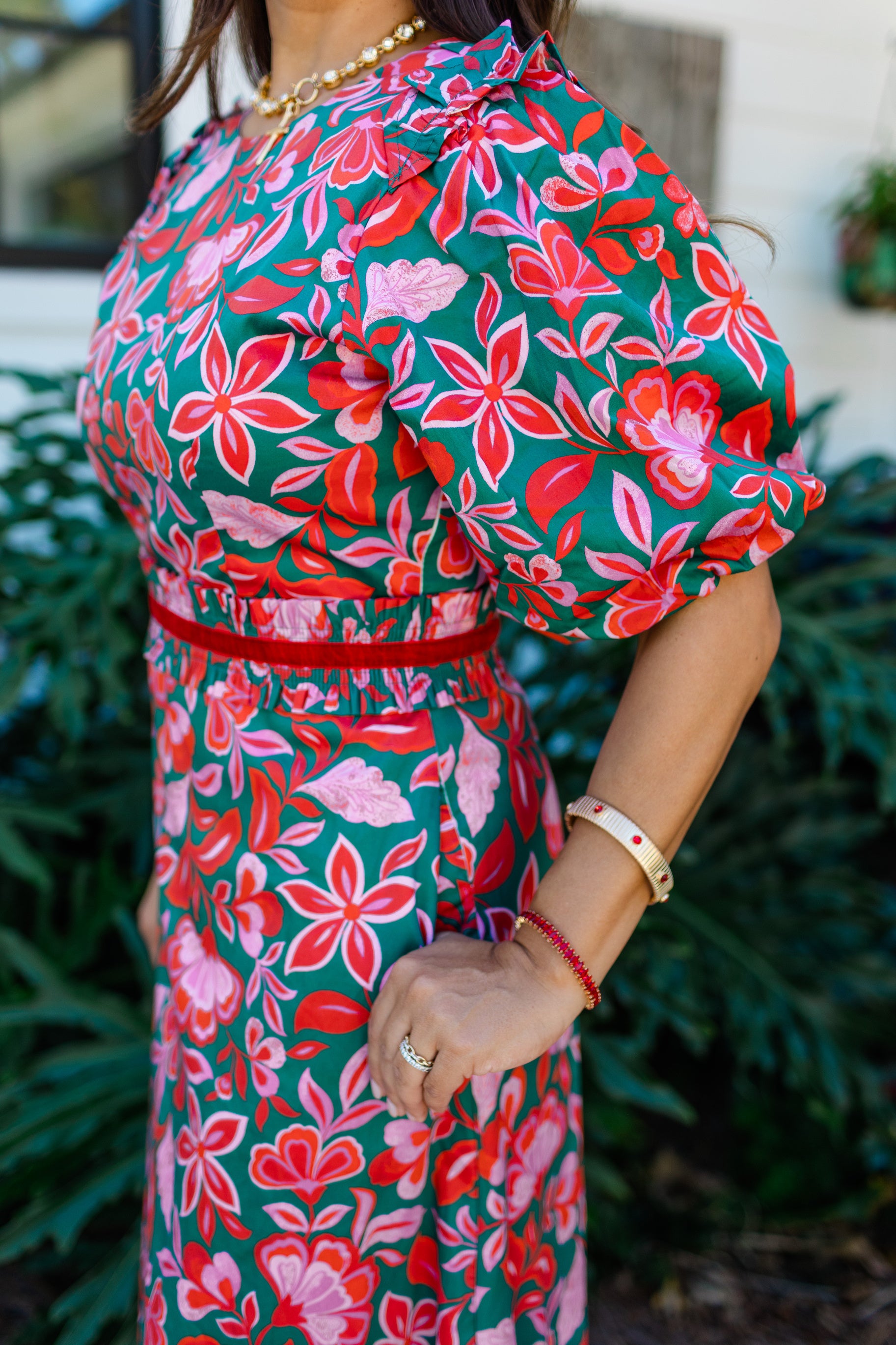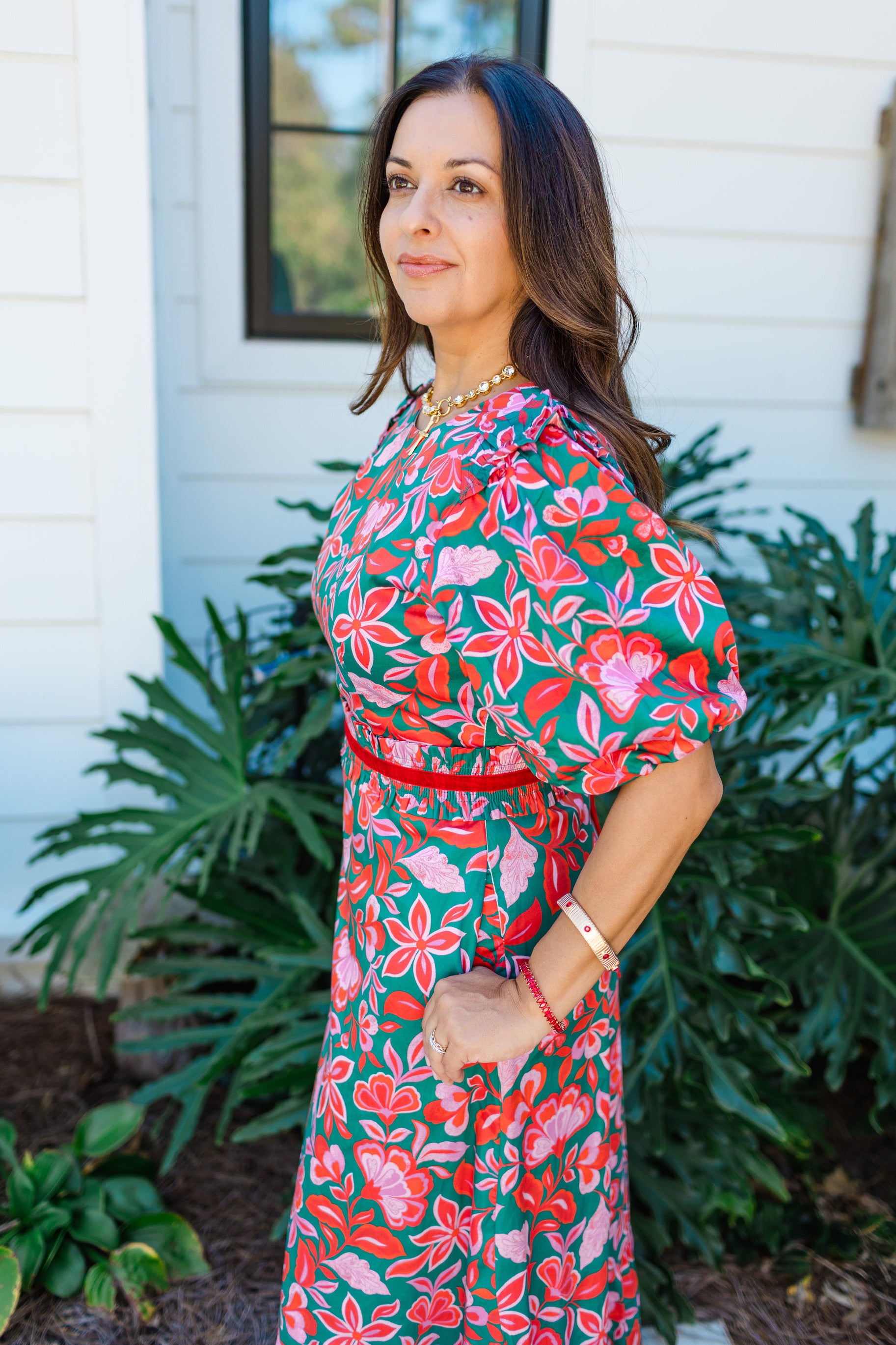 Romantic, refined, and designed with Prosperina’s signature holiday craftsmanship — The Waverly Dress is a true winter showstopper. The rich red-and-green botanical print feels festive without ever leaning literal, and the silhouette moves beautifully with a softly tiered skirt, gathered puff sleeves, and contrast piping that defines the waist in the most flattering way.