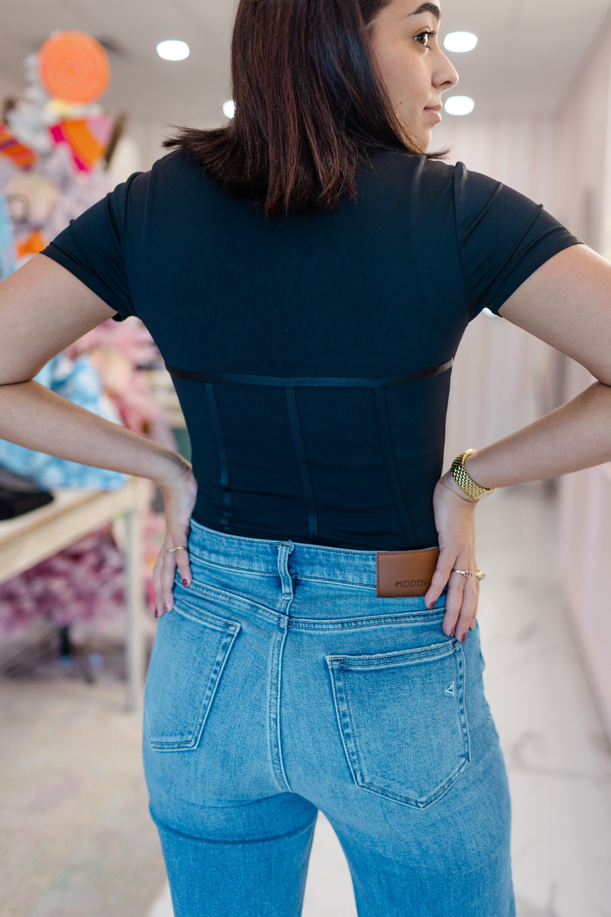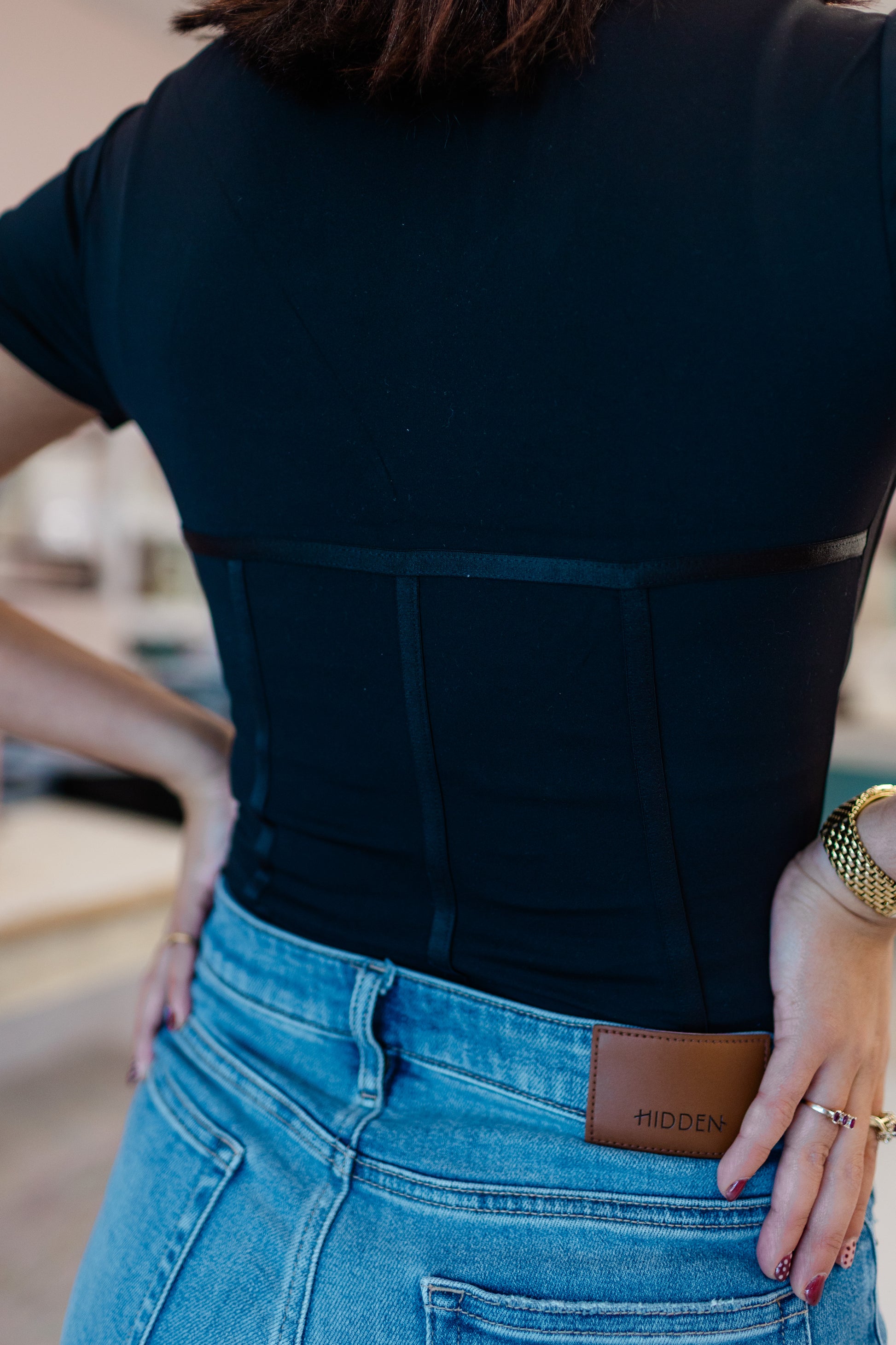Sleek and sculpted, the Weightless Scuba Corset Bodysuit in black is the ultimate statement piece. Crafted from a lightweight, stretchy scuba fabric, it smooths and flatters with a contoured corset-inspired design. The structured silhouette pairs perfectly with denim, trousers, or skirts, giving you a chic, streamlined look whether styled for day or night.